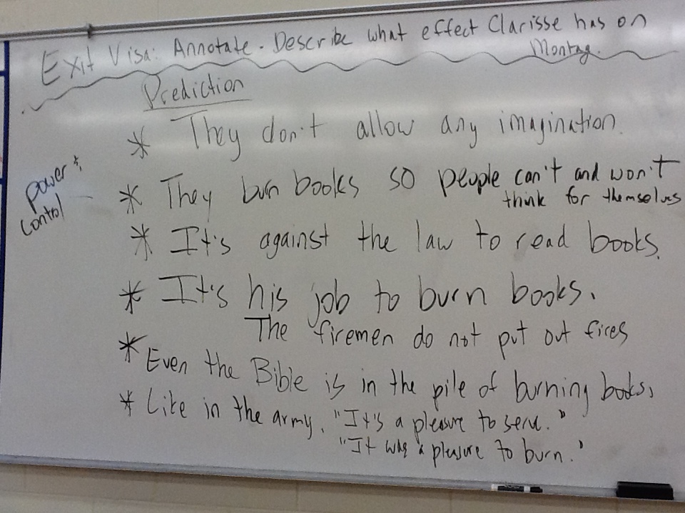 This is an image of our whiteboard today, which includes several outstanding predictions about the novel made by my 4th period class today, on the first day of reading this novel by Ray Bradbury.